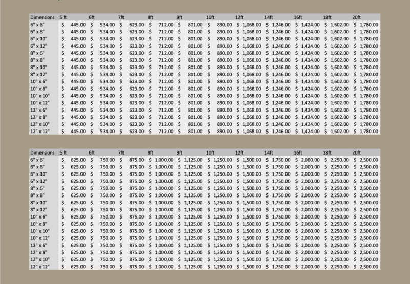 View our pricing sheet below. If you don't see our dimensions listed, contact us for a personalized quote